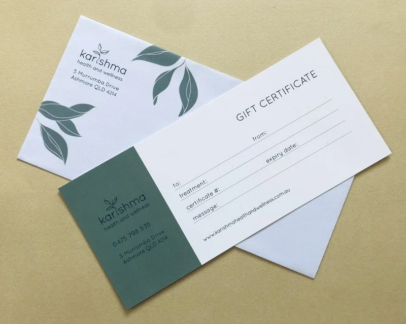 If you would prefer the gift card to have a treatment specified (as opposed to a dollar amount) or you would like a physical gift certificate (as pictured) then please contact us by phone/email.